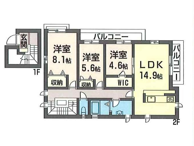 | 間取り | 3LDK | 間取り詳細 | LDK14.9 洋室8.1 洋室5.6 洋室4.6 | 専有面積 | 90㎡ |