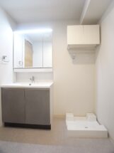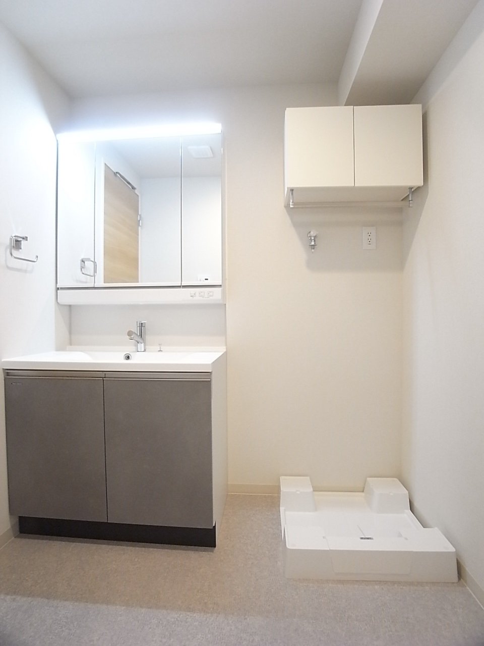 洗面脱衣所には、三面鏡のシャワー付き独立洗面台。洗濯機置き場の上部には、洗濯物を吊るすのにも利用できるバーが付いています。