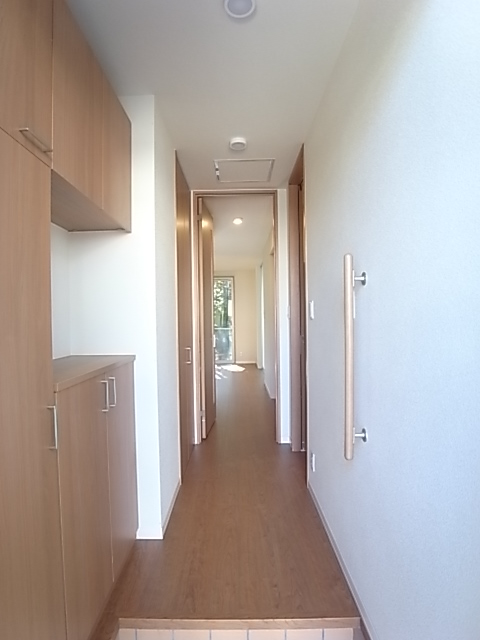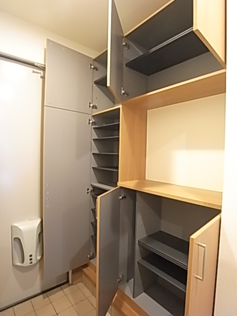 玄関の大型シューズボックスは収納力抜群。靴の脱ぎはきに便利な手すりも付いています。