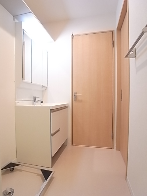 上部の棚が便利な洗面脱衣所には、三面鏡のシャワー付き独立洗面台。
